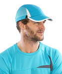 Non-crease sport fabric. Recycled PU peak, just unfold and wear. Featherweight. Tear away labels. Quick dry. Unlined. Reflective detail to peak and crown. Low profile jockey style. 2-panel with mesh side panels. Pre-curved peak. Tear-release fabric size adjuster. Decoration Guidelines: Decorating methods: Embroidery & Transfer print. Decorators access point: Open.
